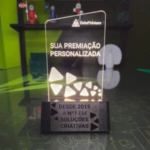 O acrílico pode ser personalizado livremente mas o tamanho do troféu é de até 20cm de altura e 13cm de largura.